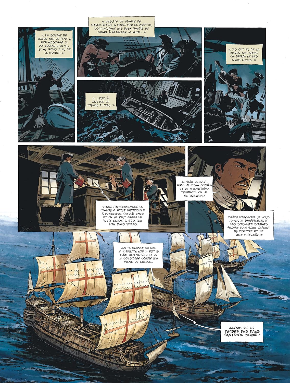 Capturés par le Spectre, pris en chasse par les Espagnols et trahis par les Anglais, Barbe-Rouge, Éric, Baba et Triple-pattes semblent très mal partis dans ce nouveau tome. Alors qu’une alliée inattendue réapparaît pour les aider, les forces en présence se préparent à écraser Barbe-Rouge et sa famille… Mais le démon des Caraïbes n’a rien perdu de sa sauvagerie… Jean-Charles Kraehn signe un scénario digne de Jean-Michel Charlier, tandis que Stefano Carloni met en scène avec une incroyable maestria combats en mers et duels épiques…